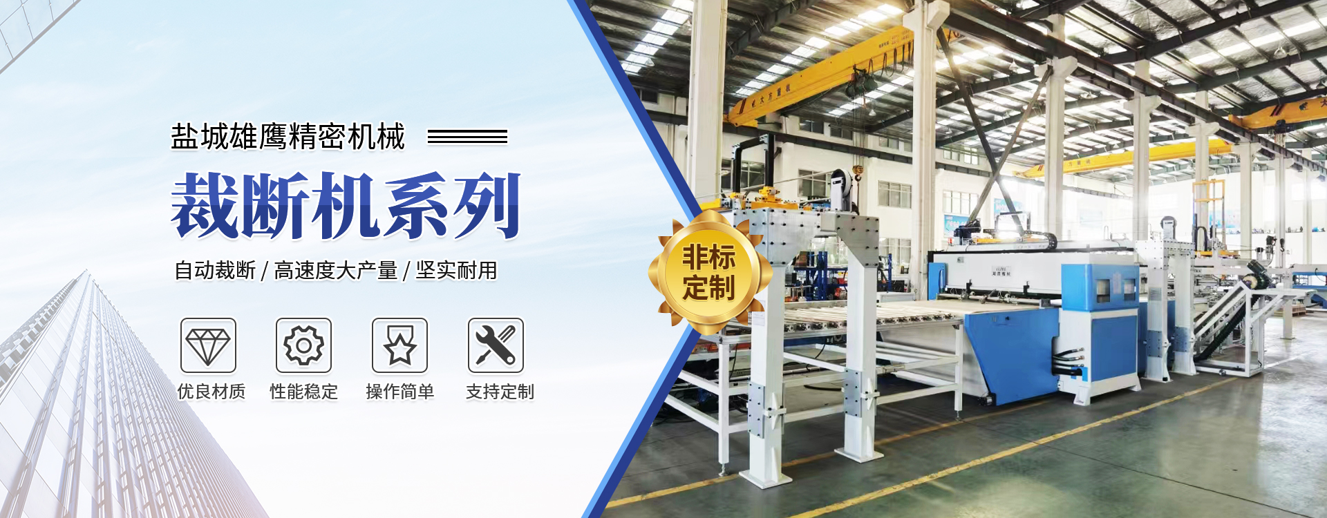 - 主營:"超鷹"牌液壓擺臂下料機、隨動式液壓擺臂下料機、液壓平面下料機、液壓龍門下料機、(旋轉頭)自動送料精密四柱液壓龍門下料機、四柱(精密四柱)液壓平面下料機、上壓板自動后移精密四柱液壓平面下料機等系列產品。